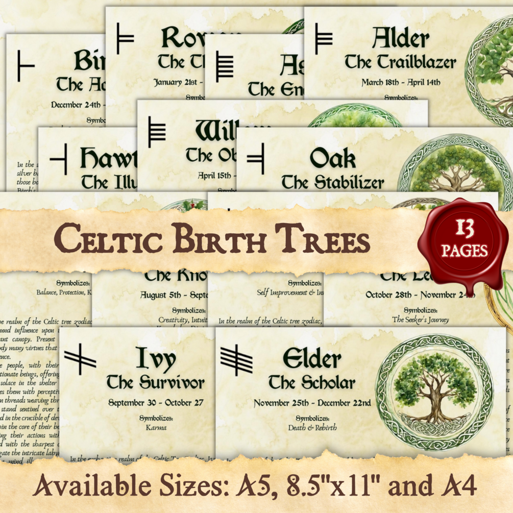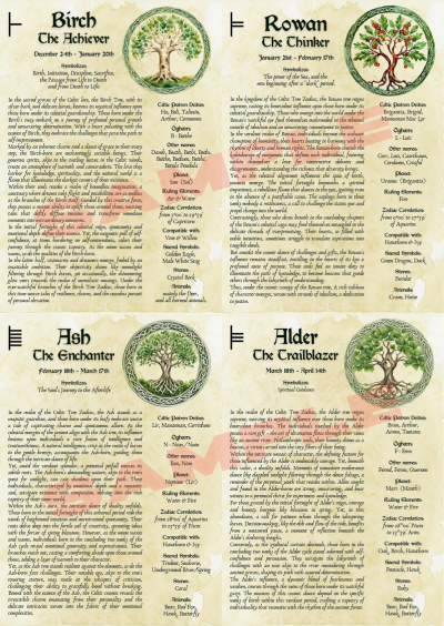 The Celtic Birth Trees of the Druid Zodiac comprised of 13 signs, with each sign governing a period of either 27 or 28 days, which corresponds to the full length of a lunar cycle. All of the signs combined to make up a full lunar year, which coincides with the Celtic calendar.
