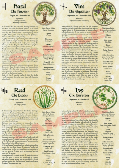 In these pages you will find all corresponding information for each Birth Tree, including the characteristics of individuals born under the influence of each Zodiac Tree.